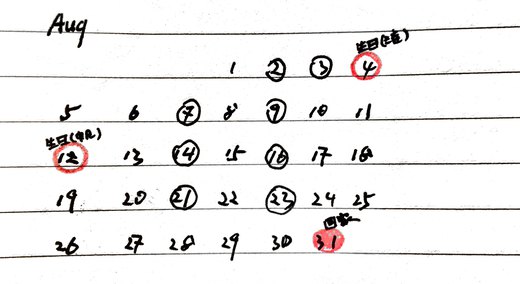 看到这里,你可能会说,如果每天都有一堆日程,也要把它们都写在纸上吗?当然不用,写在纸上一般只是最重要的日程,它们往往起到标识性的作用,比如好友生日、假日、截稿日,写好后扫一眼,就知道该月日程紧不紧,从而合理安排时间。我还喜欢把不确定的事情写在纸质日历上,最近就打算九月初和朋友小聚一番、贴贴秋膘,这种事情看的就是天时地利人和,提前十天半个月定不下来、写不进电子日程,但是在纸质日历上画一个小圈就比较合适,能起到温和的提醒作用,不至于像日历 App 那样扼着你的喉咙告诉你:喂,再过一礼拜就要聚会了啊。