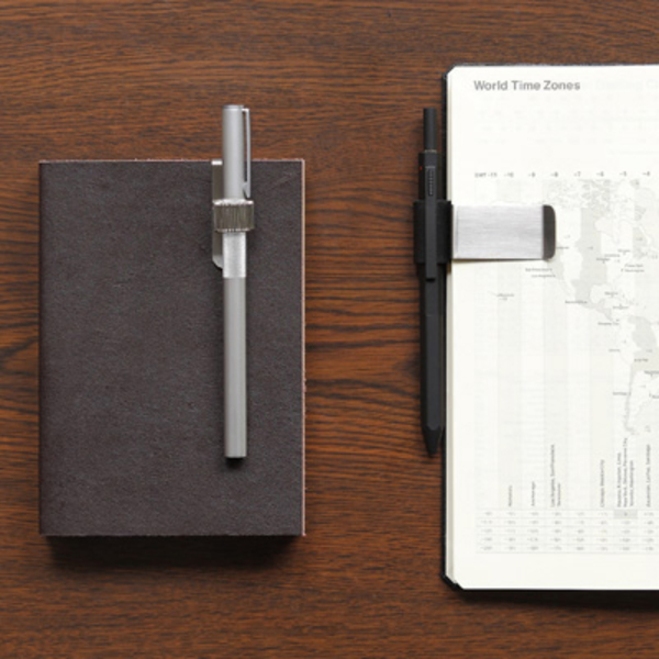 我更习惯在手账脊背上切一个小口子,当作隐形笔插,直接把笔夹插在里面。