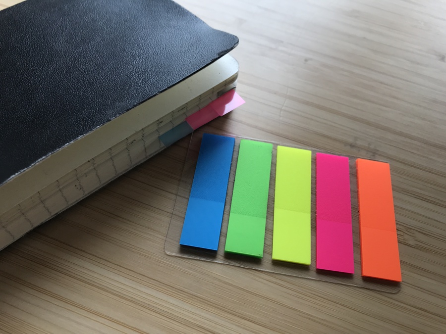 索引贴:如果书签的颜色不够用,也可以用彩色索引贴来标注重要的页面。索引贴颜色选择丰富,如果你同时记录多个主题的内容——比如把日程、购物单、菜谱、设计图全写进手账——索引贴会更加灵活。