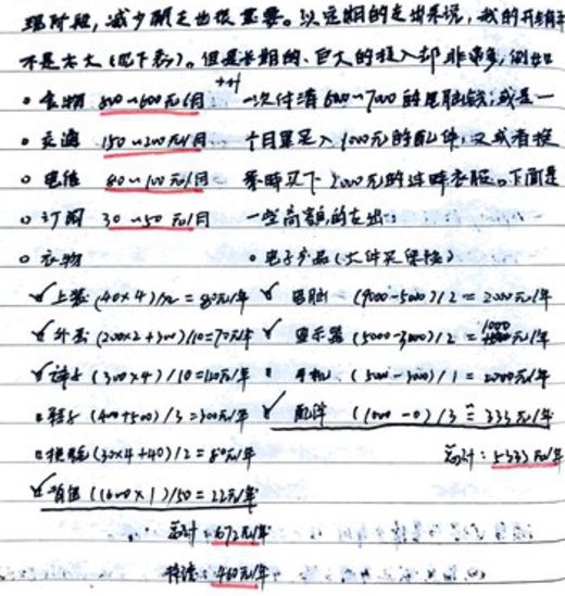 两支笔帮我理清思路、勾出重点,回顾起来也更清晰。我每月都在手账上简单分析财务状况、做规划,第一遍用黑笔写下思考的整个过程,第二遍拿红笔划出最重要的数字。以后回过头来看,就先扫一眼红色标注,如果对一个数字有疑问1 ,再检查黑色的思考过程。