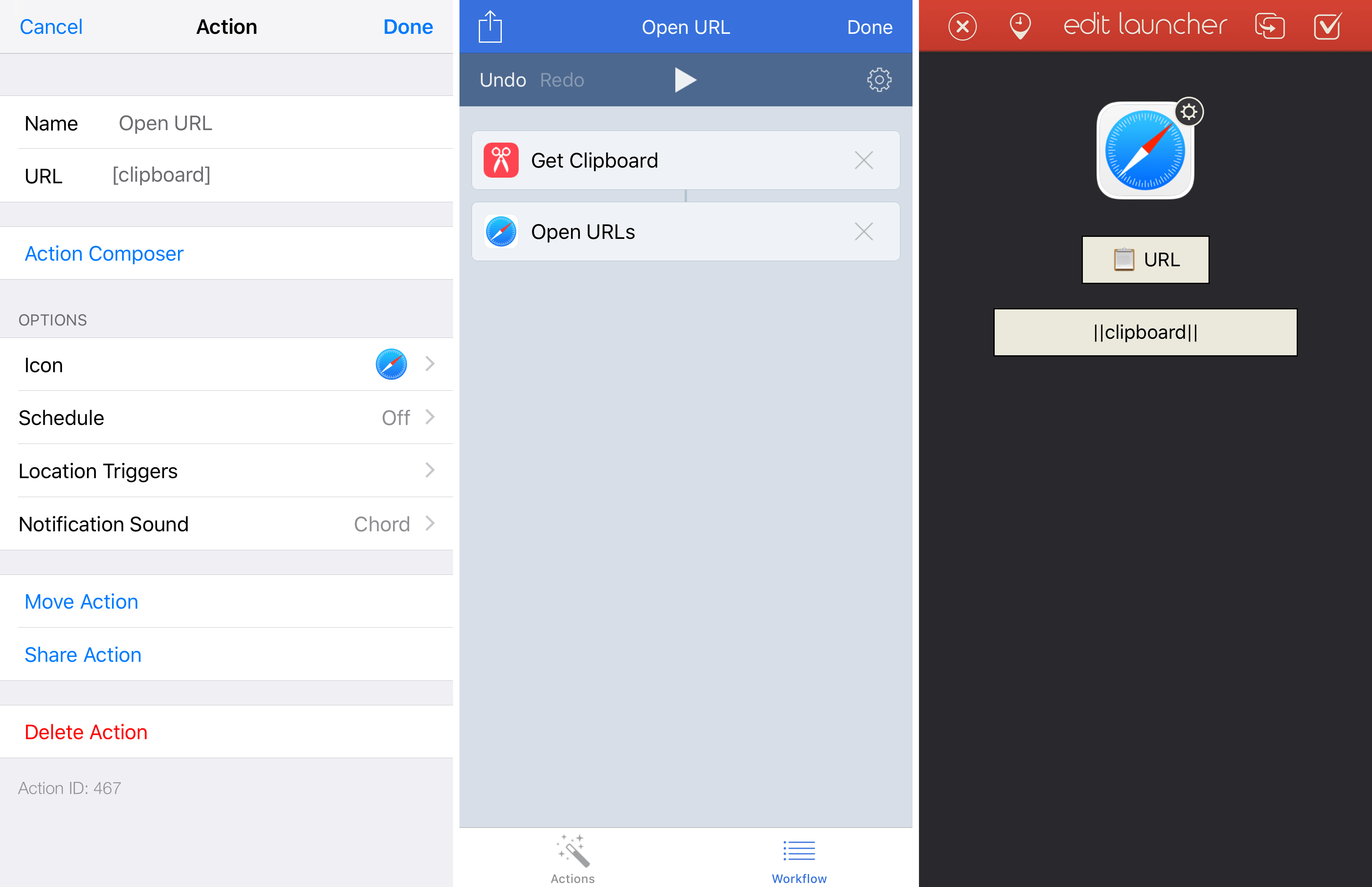 如果你想直接跳转客户端,而不是这样在 Safari 打开粘贴的链接的话,可以使用 Launch Center Pro、Workflow 或者 Launcher 这样的工具,做一个直接打开剪切板链接的动作。它们的编写方式很简单,如截图所示: