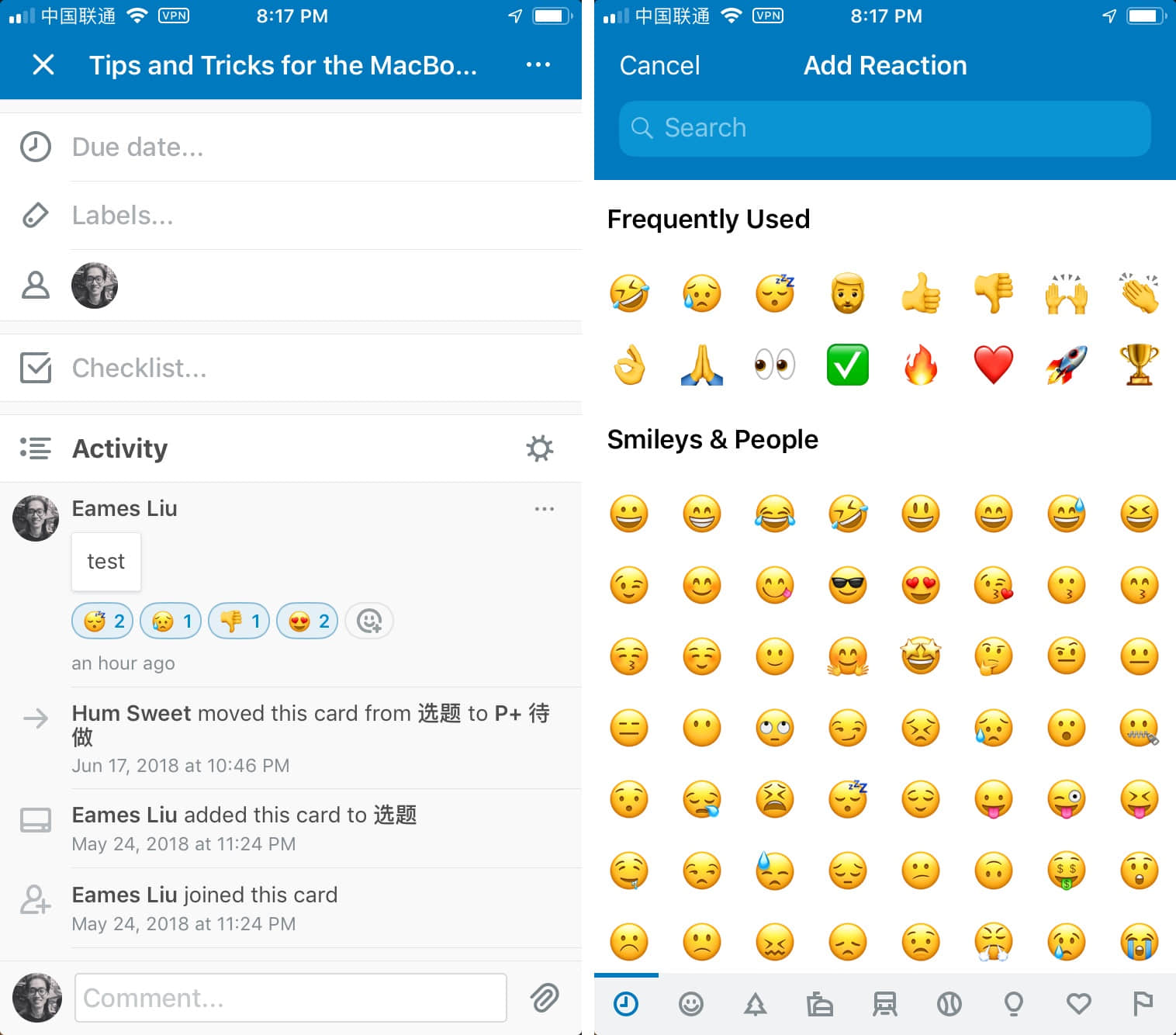 @文刀漢三:Trello 在新版加入了表情回复的功能,我们可以用 Emoji 表情对评论进行快速回复。