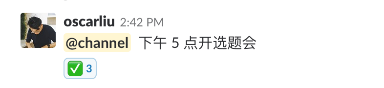 比较早采用了这项功能并将之发扬光大的软件应该是 Slack。表情回复在聊天中的作用很明显,比如很多人会在收到消息之后回复「收到」以告知对方自己已经收到并阅读了消息,但其实不是所有人都喜欢收到「收到」的回复,因为这条消息往往会给对方弹一条通知。比如老板在群内说了一声「下午 2 点开会」,如果全公司的人都回复「收到」,那么老板就会收到一大堆「收到」,此外也会造成刷屏。