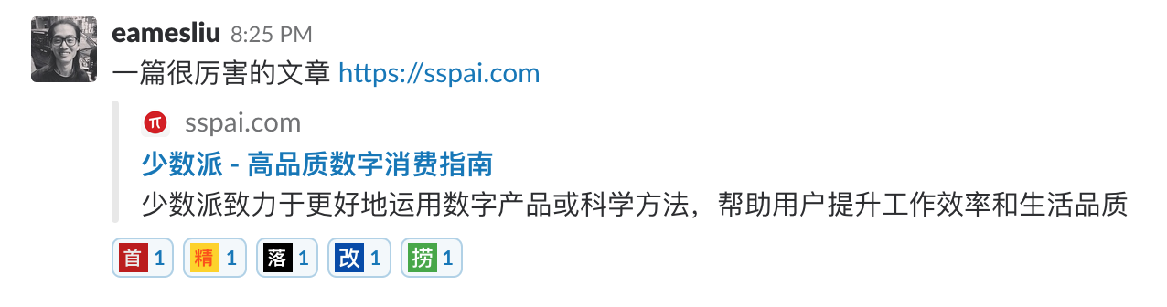 而且 Slack 做得更厉害的是,允许用户上传自定义表情,比如我们编辑部就制作了一系列审稿的表情来进行快速标记。