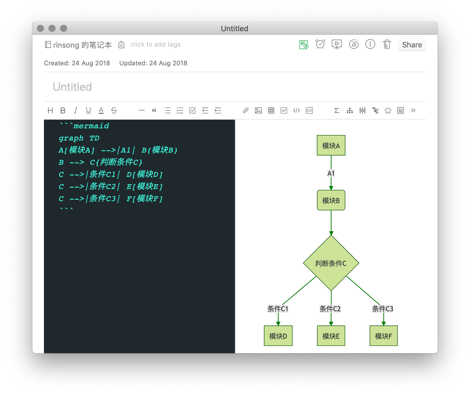 在印象笔记之前,主要有 MWeb、Typora 等比较 Geek 风格的 Markdown 编辑器支持拓展语法,印象笔记后来居上,一下子把常见图表的语法一网打尽,可以说是非常让人意外的。