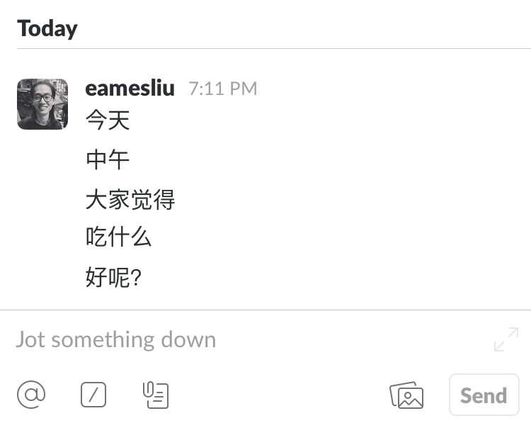 和微信不同,Slack 没有采用气泡式的聊天界面,而是直接将文字摊出来,有利于显示更多文字信息,也更鼓励大家在一条消息内把话说完。