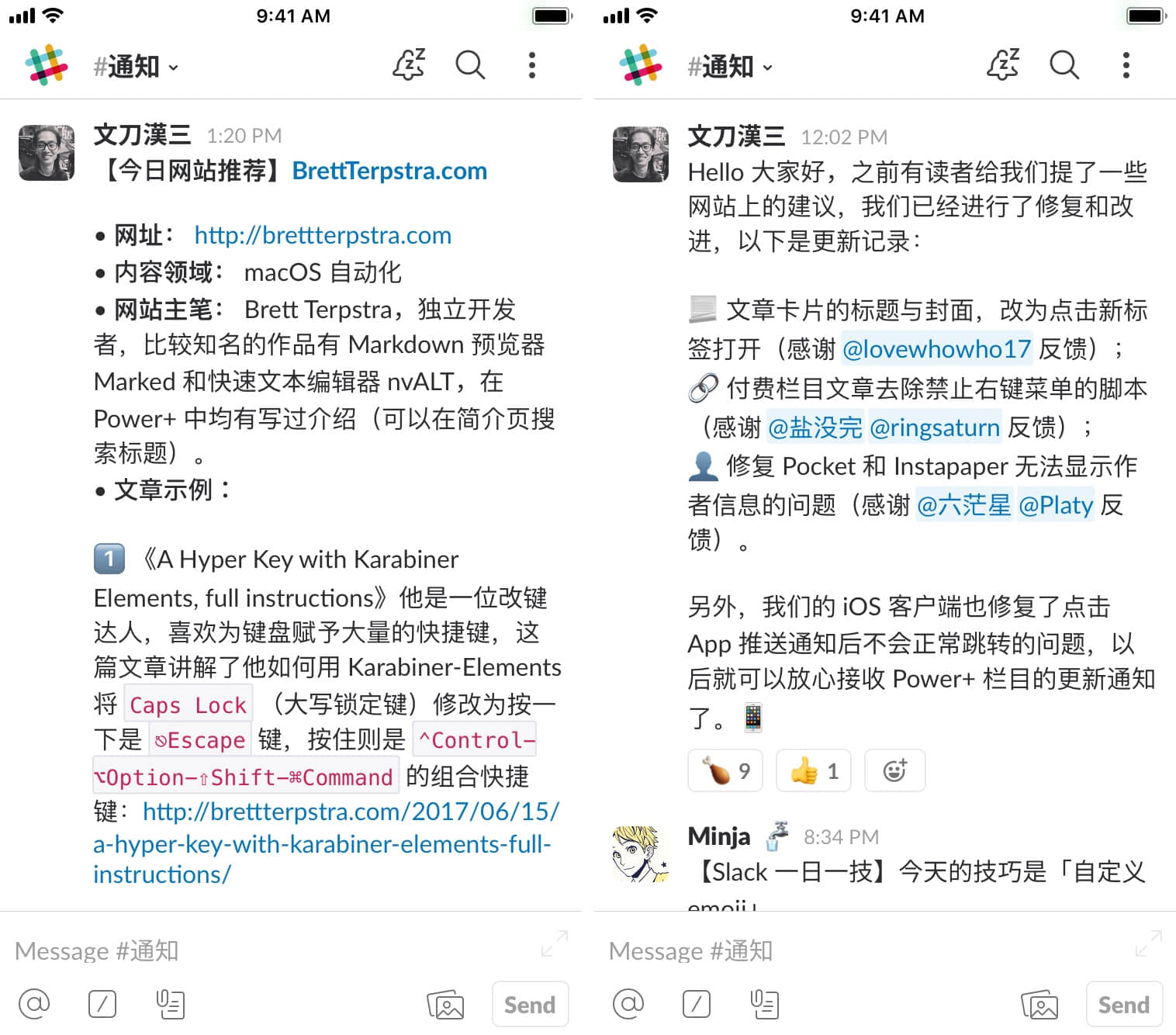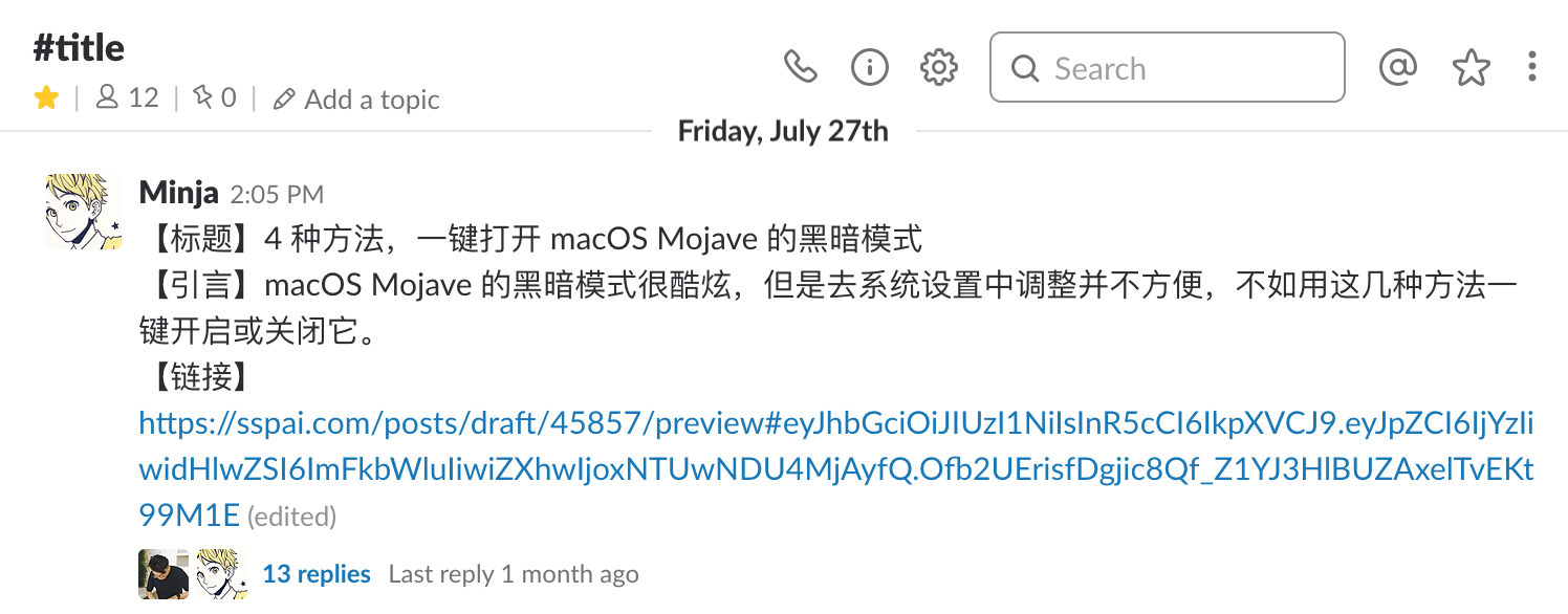 对于一个刚加入公司的新员工来说,Slack 的这种频道模式也是更加友好的。新员工可以根据频道来快速了解公司的结构以及正在进行的项目,并通过历史聊天记录来了解频道的发言规则。比如在少数派里,有一个专门用于审核标题和引言的频道,在这里发布信息的格式是固定的,我们也不会在主时间流里进行任何讨论。对于新成员来说,只需要看一眼历史记录就能知道频道规则,减少重复说明的交流成本。