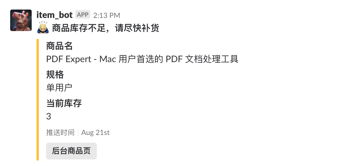 如果你们团队有动手能力比较强的技术人员,甚至可以将自己网站的 API 接入 Slack。比如我们有一个专门用于通知商城库存不足的频道,当商品库存低于 10 时,就会自动发送一条通知到群里,提醒我们进行补货。