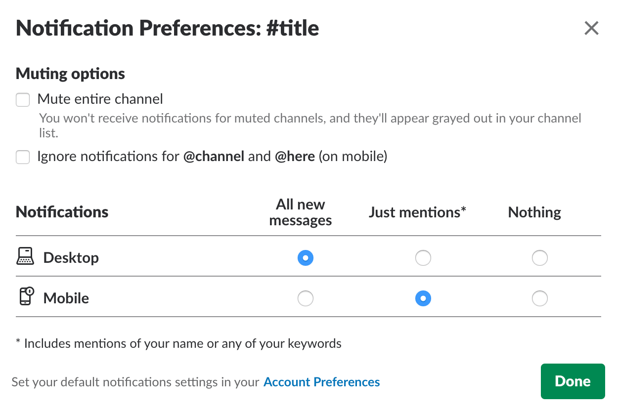 另外,我们可以可以将电脑和手机的通知分开设置。比如电脑是工作设备,那么就可以把一些重要频道的通知全开;而手机一般在下班后使用,那么就可以只开 @ 到提醒。