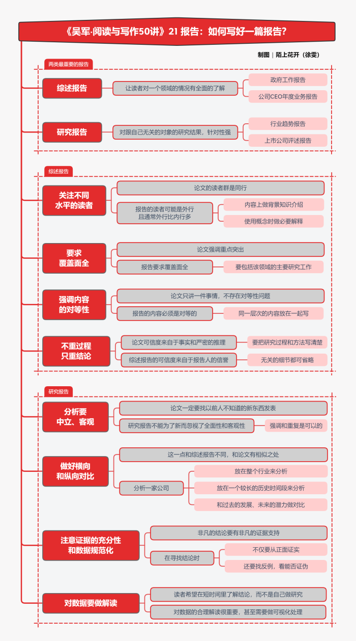写报告是一个职业发展的高级技能,回看自己的发展,在这方面是非常欠缺的,学习,研究,实践了不少东西,但除了之前的项目,没有把他们系统的写成报告,现在我越来越意识到,定期把学习工作的得失写成报告,是非常重要的。 要在自己的领域做的好,需要既深又广的系统化的知识体系,这可能也就是英文里research和review,都有一个Re(反复的回头看,反复的向前看)。 研究论文(research)在于从新的维度和视角,拓展知识体系,着重在一点的突破,也就是论文的要求,介绍研究基础,给出研究结果,明确研究方法,分析数据,目的是证明方法和结果的可重复性,和结果的正确性和可信性; 综述报告,是为了让大众快速的了解一个领域现状,形成整体认知和评价,所以要通俗易懂,全面客观,注重整体结构,放弃纠缠细节。 研究报告是为之后的决策服务的,所以不单要给出明确的,主观的结论,也要给出如何得出结论的研究和分析过程,包括从历史角度的纵向研究,看背景和趋势;从同类的横向研究,看相对优劣势和合理性;在技术上,从预先条件,看可行性和先进性;从更小颗粒度,看不同方面表现,看表面的得失和背后的系统。以及收集了哪些方面的信息,如何利用事件和数据,如何分析和做出合乎逻辑的推理判断。 对于自己,之前总结的知识卡片,和做的一些思维导图,要定期写成报告,写的过程,就是进一步整理思路,发现问题的过程。 而且对于自己在做的事,也要用research和review的态度,总结出一句话的本质,重要的预先条件,实施的步骤,所做的人力,财力和技术的准备,有明晰的思考和认识。4小时前